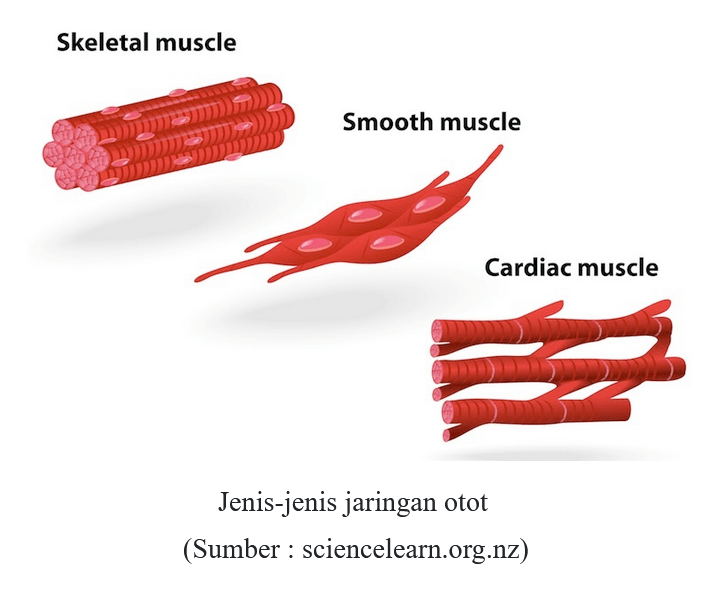 Otot terbagi menjadi tiga jenis yaitu otot lurik, otot polos dan otot jantung. Otot rangka adalah jaringan yang terbuat dari sebagian besar otot yang menempel pada tulang. Otot lurik atau otot rangka . Bentuk bergelendong dengan kedua ujungnya meruncing. Sel otot polos berbentuk gelendong, yaitu bagian tengah menggembung dan bagian tepinya meruncing.